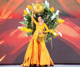 NTK Vũ Lan Anh mang đến hình ảnh cỏ lau, cây lúa, thốt nốt, nghề hái dừa, văn hóa Khơ-me… Mặc trang phục có phần cồng kềnh, thí sinh Bùi Thị Ánh Vương chao đảo, suýt ngã.
