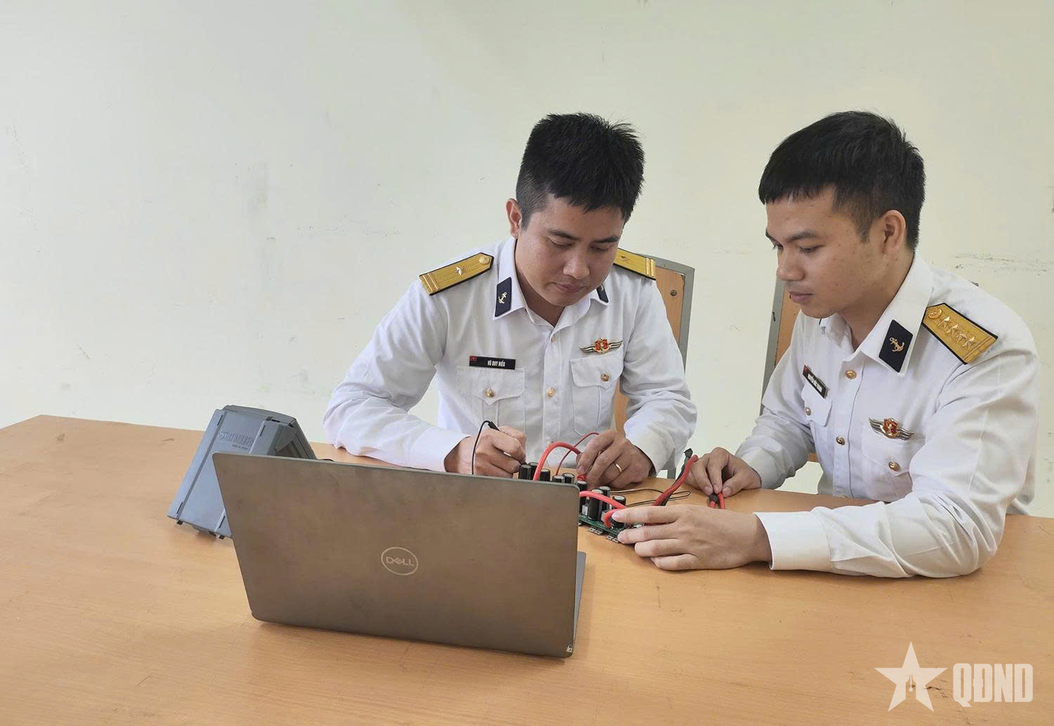 | Thiếu tá Vũ Duy Hiếu (bên trái) cùng đồng đội thường xuyên nghiên cứu phát huy sáng kiến, cải tiến kỹ thuật vào thực tiễn. |