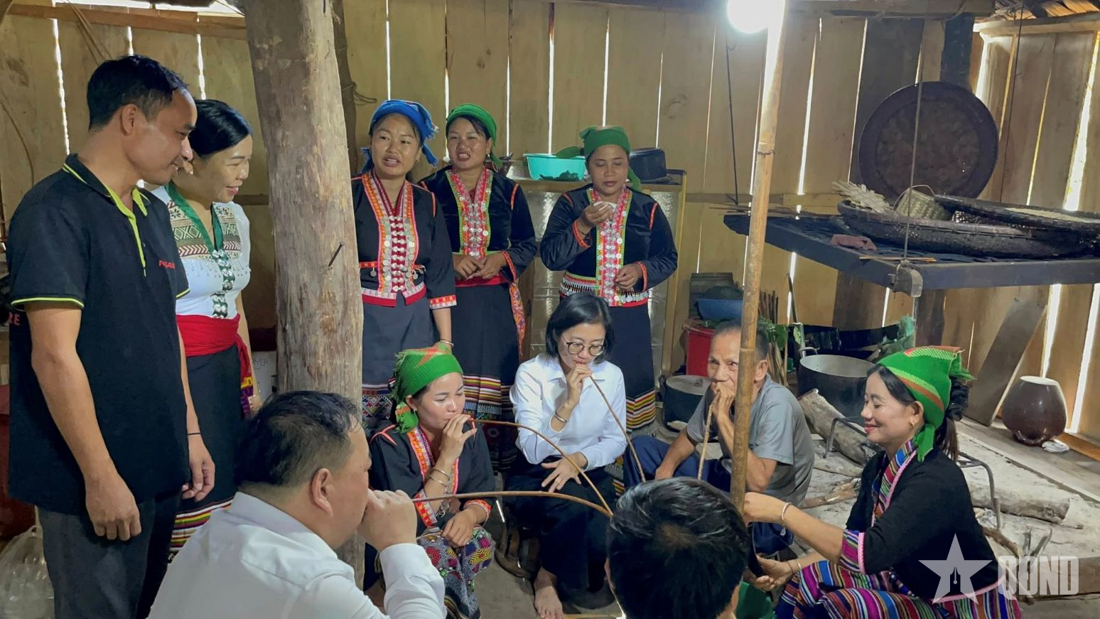 Cán bộ địa phương và người dân uống rượu cần chia vui cùng gia chủ.