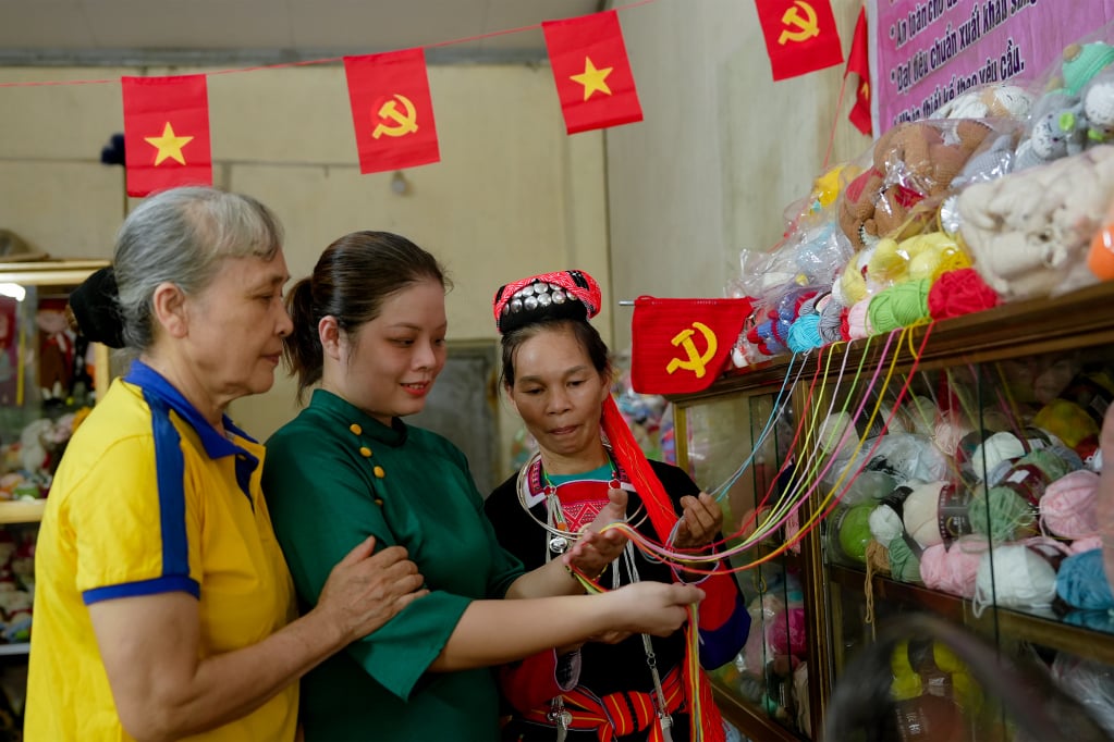 Bà Vũ Thị Măng (ngoài cùng, bên trái), 71 tuổi, 45 năm tuổi Đảng, chia sẻ: Những ngày đầu còn nhiều bỡ ngỡ, nhưng nhờ sự tận tình chỉ dạy của Linh, tôi dần trở thành thợ đan móc lành nghề, có thu nhập ổn định. Tự tay thêu nên những lá cờ Tổ quốc, cờ Đảng được du khách yêu thích và còn xuất khẩu ra nhiều quốc gia, đó là niềm vui, niềm tự hào, động lực để chúng tôi thêm yêu cuộc sống.