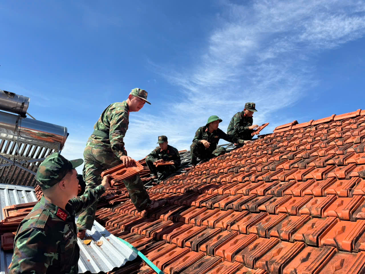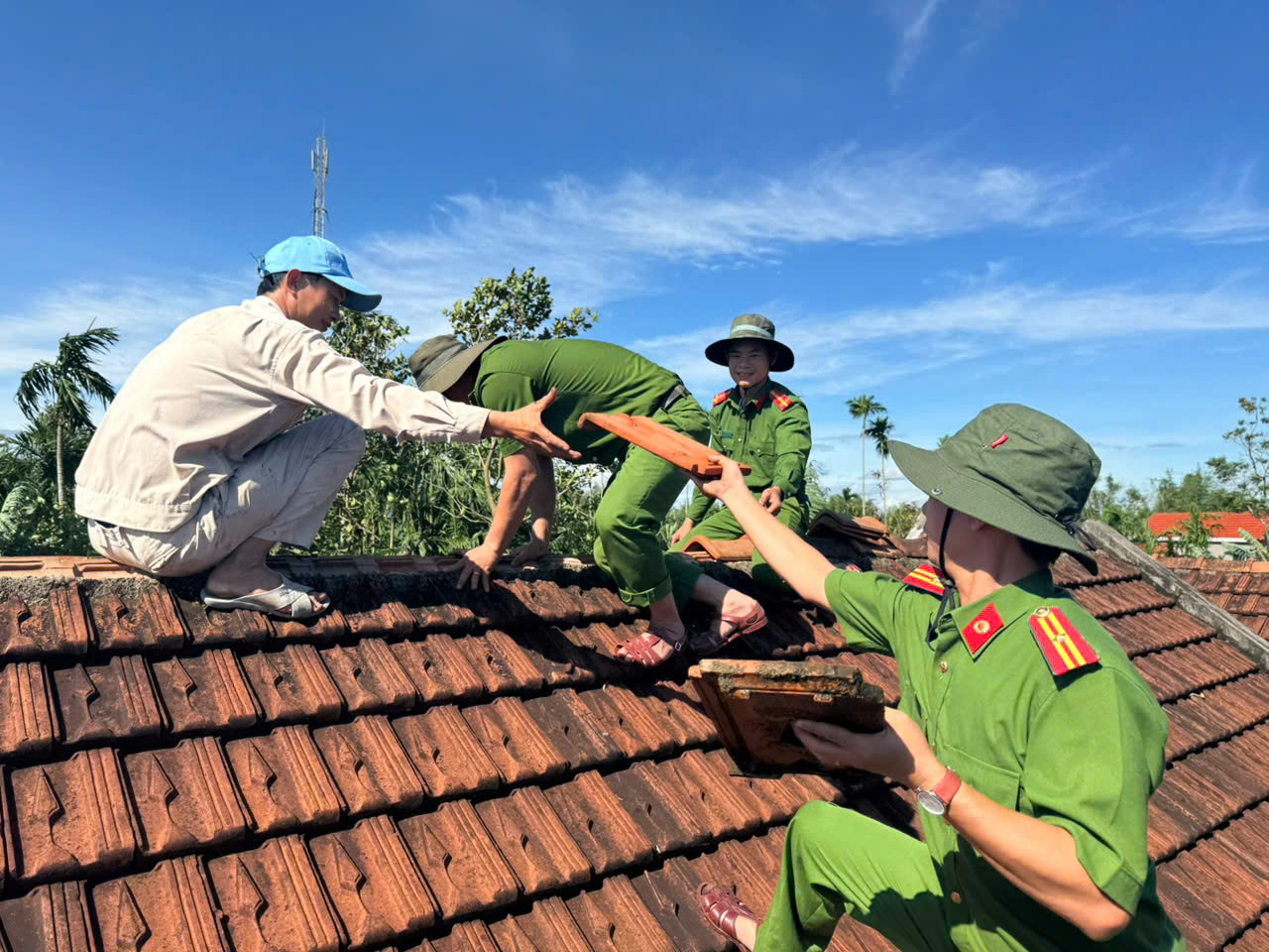 Giữa khung cảnh ấy, những người lính, công an, đoàn viên thanh niên lại lặng lẽ dựng từng mái tôn, nhặt từng viên ngói, giúp người dân đứng dậy sau đêm bão giông.