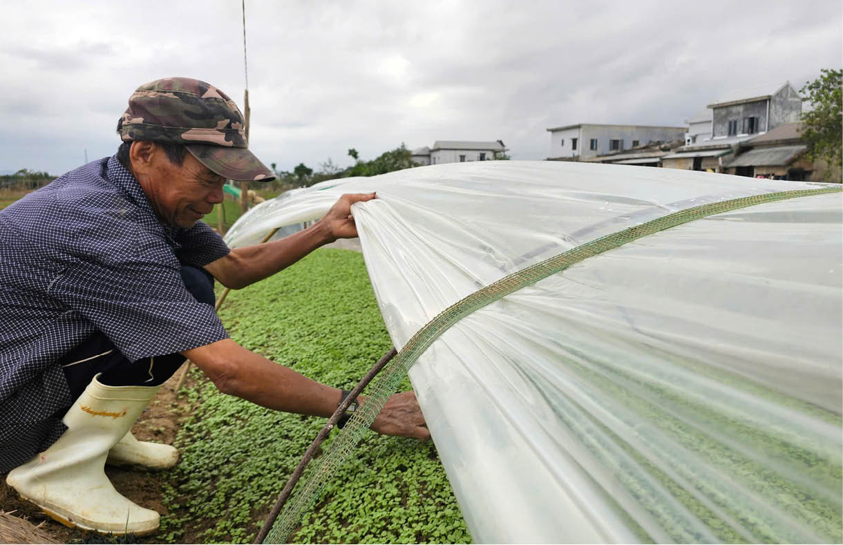 Trên thửa ruộng rộng hơn 750m2, ông Lê Hải, 60 tuổi, thôn Tây Thành cặm cụi xới đất, phủ tấm ni-lông lên những luống rau mới gieo. Với ông Hải, mảnh ruộng này là cả nguồn sống. Trận lũ cuối tháng 10 khiến nước ngập sâu, cuốn trôi hơn chục luống rau chưa kịp thu hoạch, xem như mất trắng. “Nghe dự báo thời tiết nói sắp có mưa nữa nhưng tôi nóng ruột, đất để lâu không làm thấy bứt rứt trong người. Mấy ngày nay tranh thủ nước rút, tôi ra đồng làm lại. Luống cải này tôi gieo được 5 ngày rồi. Nếu trời thuận, gần nửa tháng nữa là bán được”, ông vừa nói vừa chỉnh lại tấm phủ.