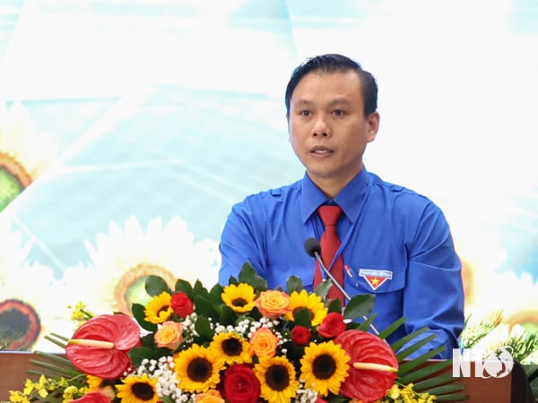 Anh Huỳnh Hữu Phúc, Uỷ viên Trung ương Hội LHTN Việt Nam, Bí thư Tỉnh Đoàn, Chủ tịch Hội LHTN Việt Nam tỉnh Ninh Thuận khóa 6 phát biểu khai mạc phiên thứ nhất đại hội. Ảnh: P.Bình