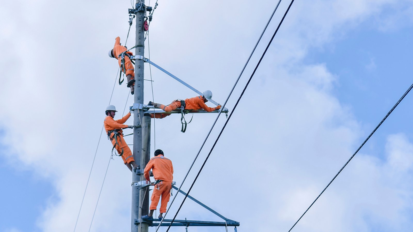 Công nhân Công ty Điện lực An Giang (PC An Giang) thi công nâng cấp đường dây 110kV Rạch Giá 2 - Minh Phong.