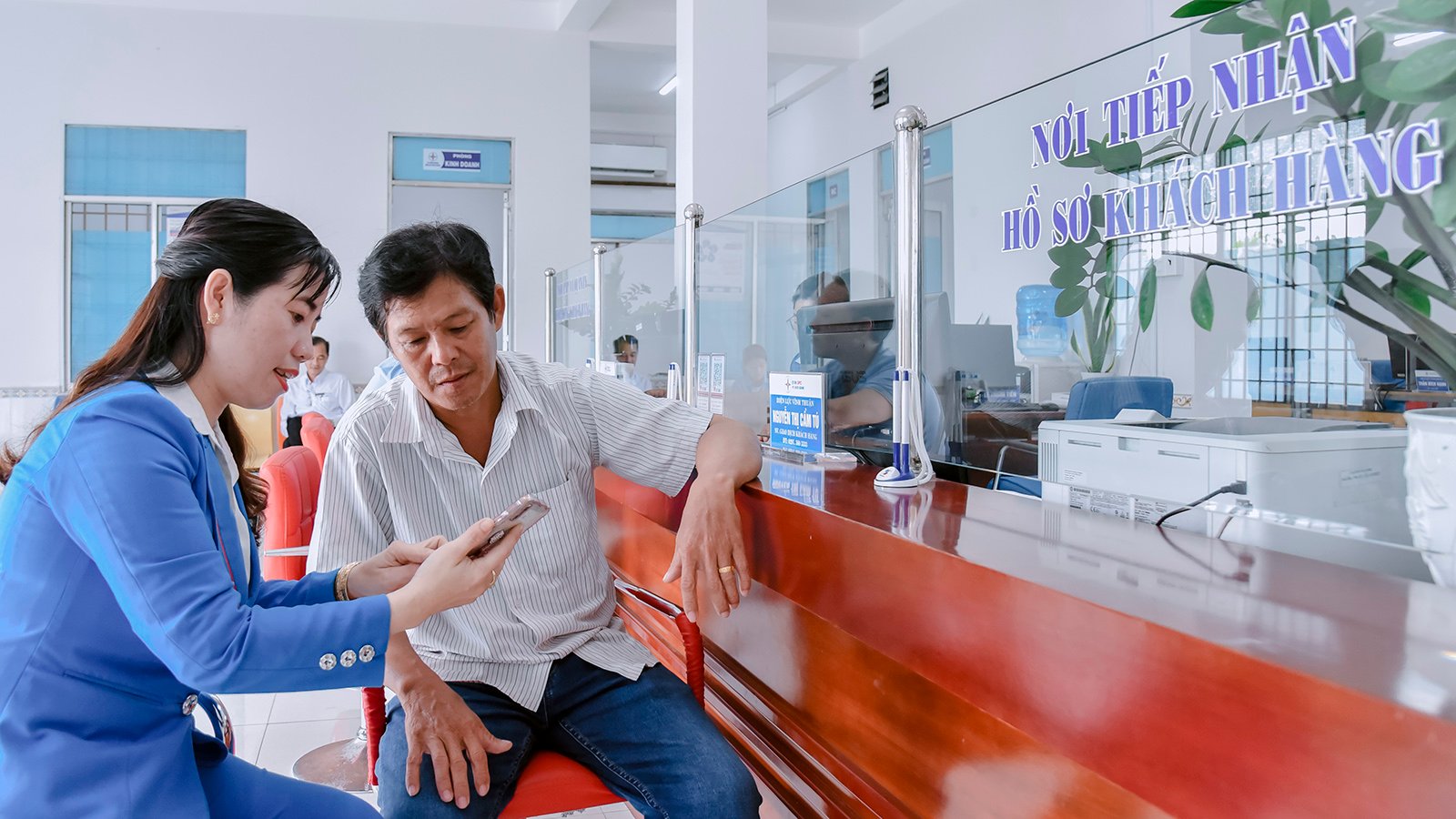 Nhân viên PC An Giang hướng dẫn khách hàng kiểm tra sản lượng điện tiêu thụ thông qua app chăm sóc khách hàng của Tổng Công ty Điện lực miền Nam (EVNSPC).