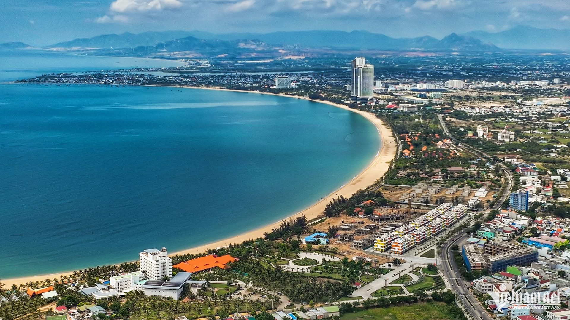 Trong ảnh, bãi biển Bình Sơn-Ninh Chữ có hình vòng cung dài khoảng 10km, tạo nên khung cảnh thơ mộng và hấp dẫn.