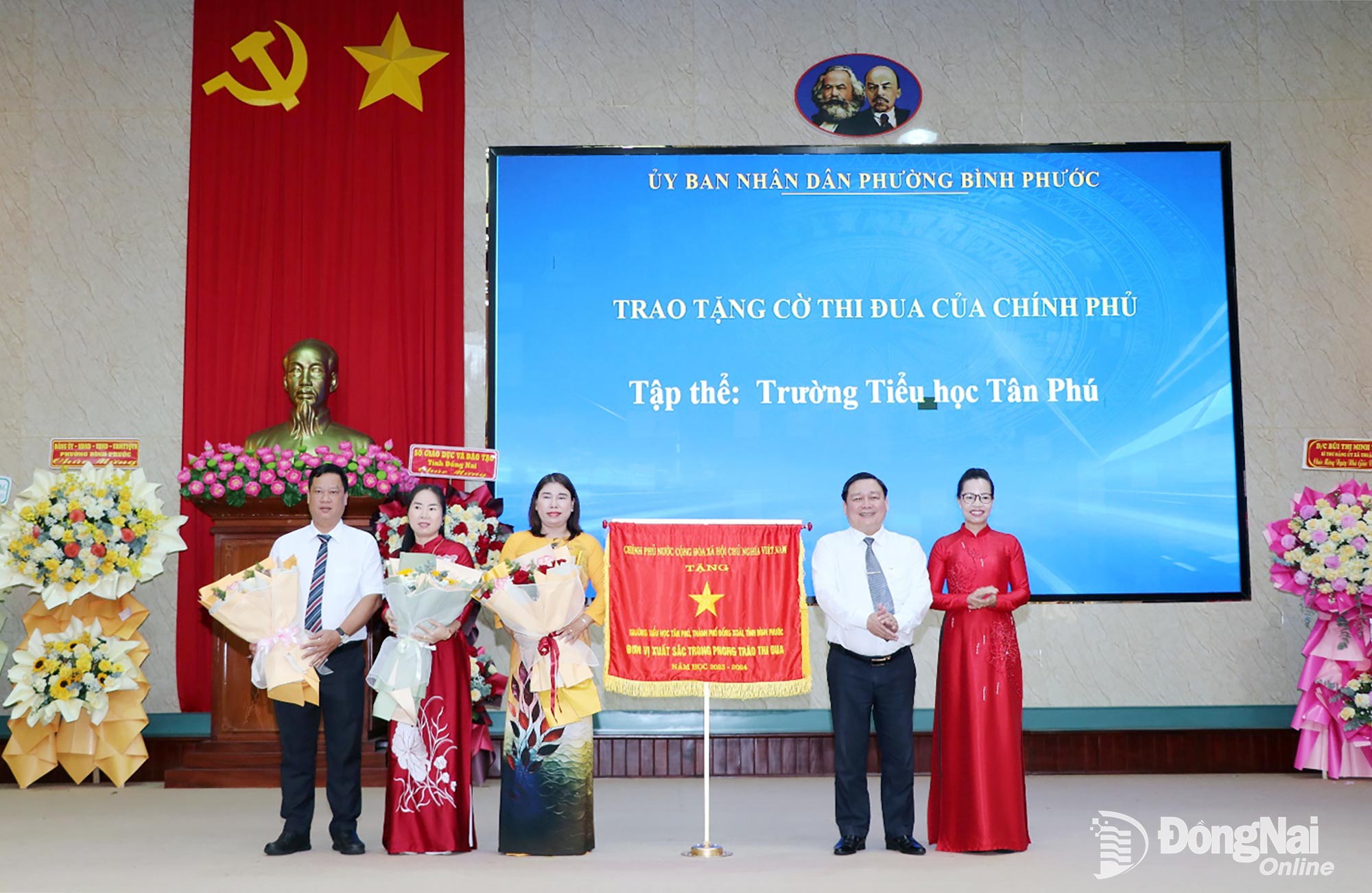 | Các tập thể, cá nhân của ngành giáo dục phường Bình Phước nhận cờ thi đua và bằng khen của Thủ tướng Chính Phủ. Ảnh: Nhã Trâm |