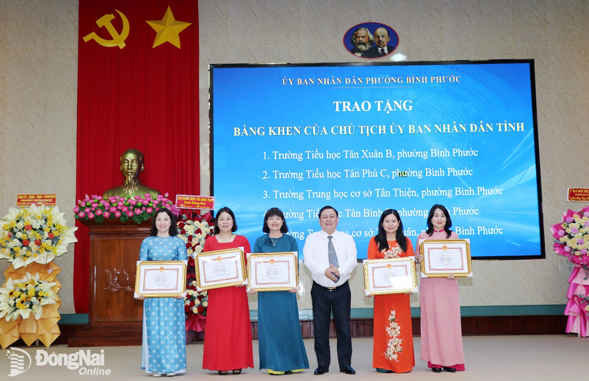 | Giáo viên, học sinh giỏi các trường học của phường Bình Phước được tuyên dương. Ảnh: Nhã Trâm |