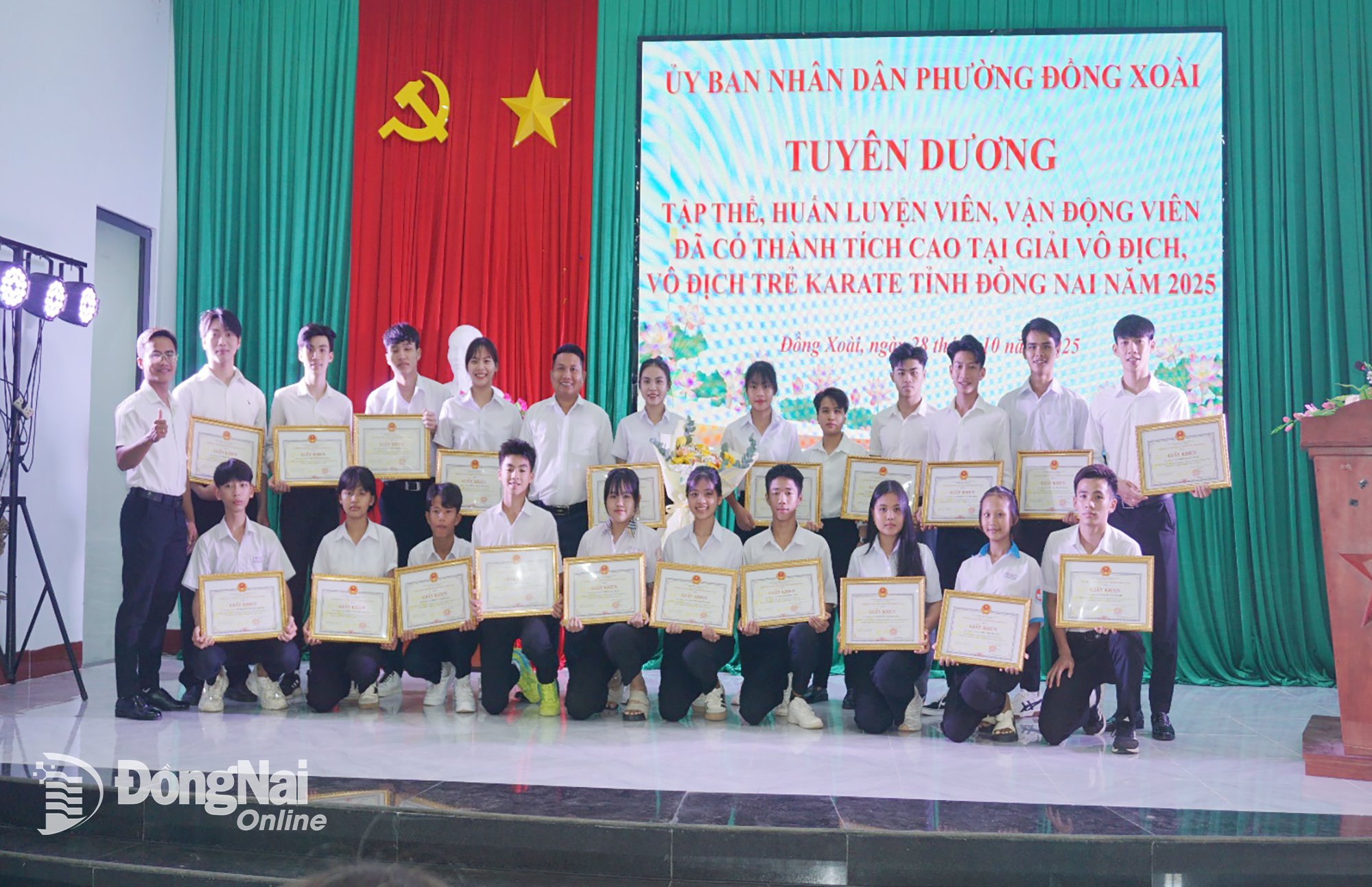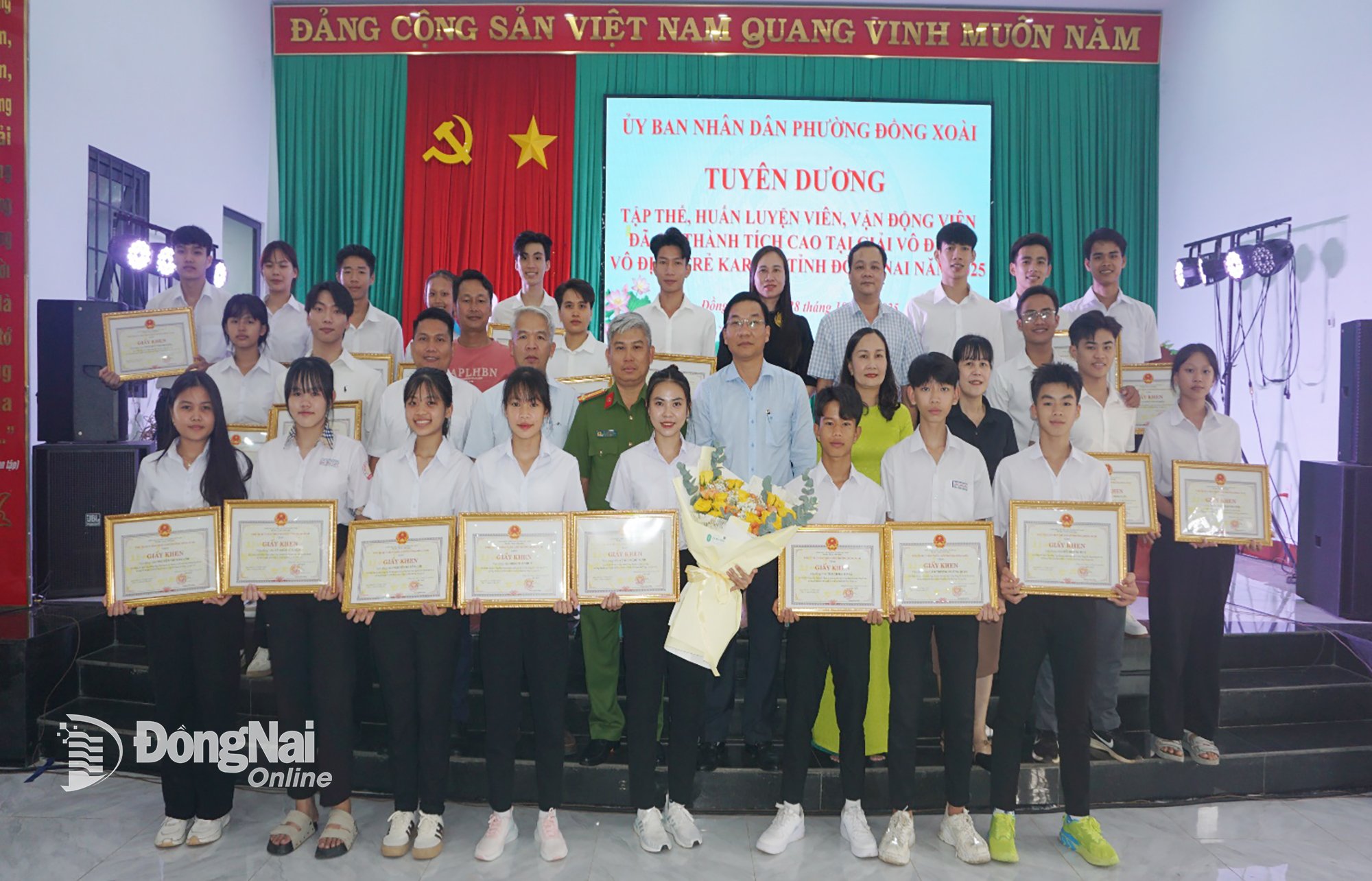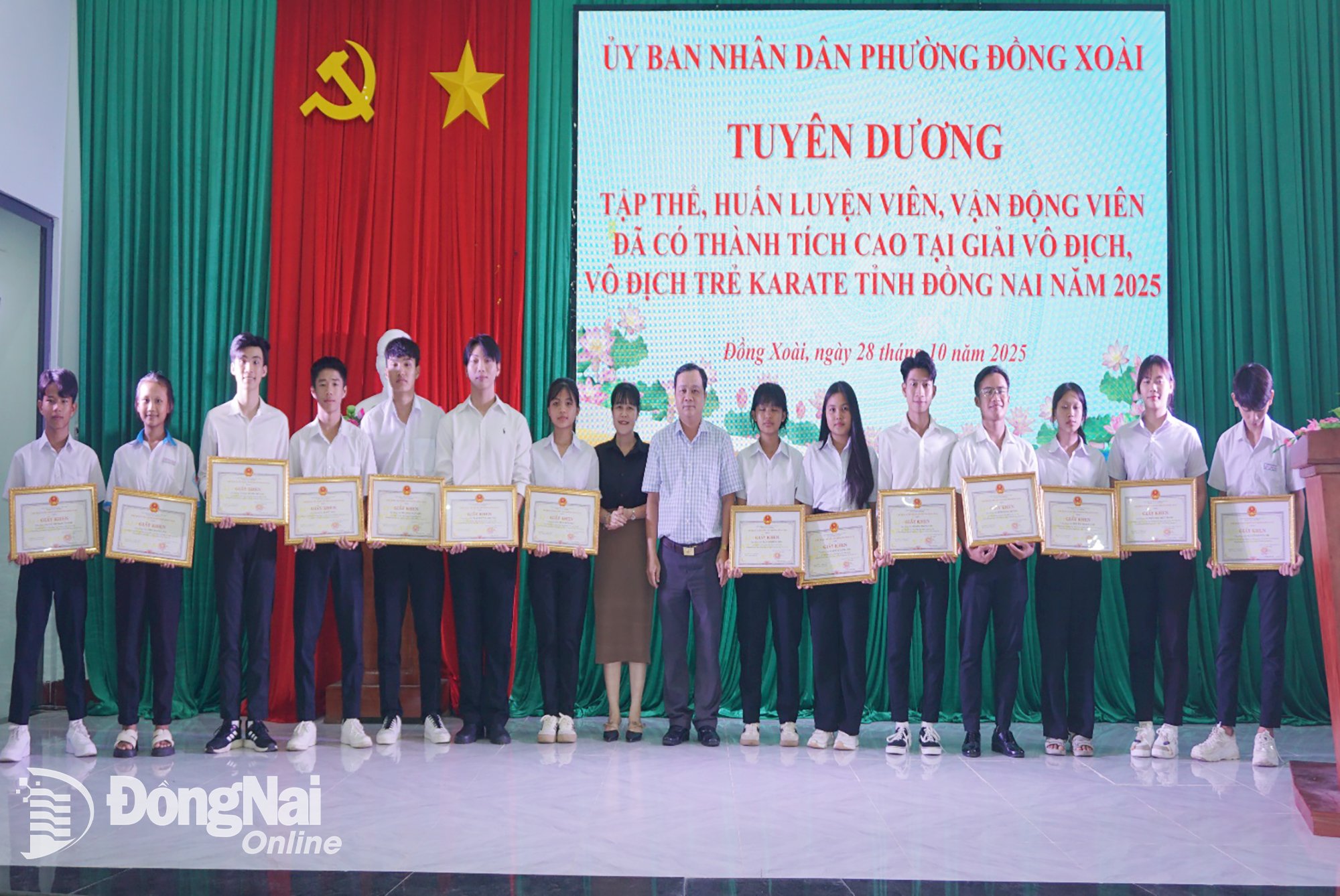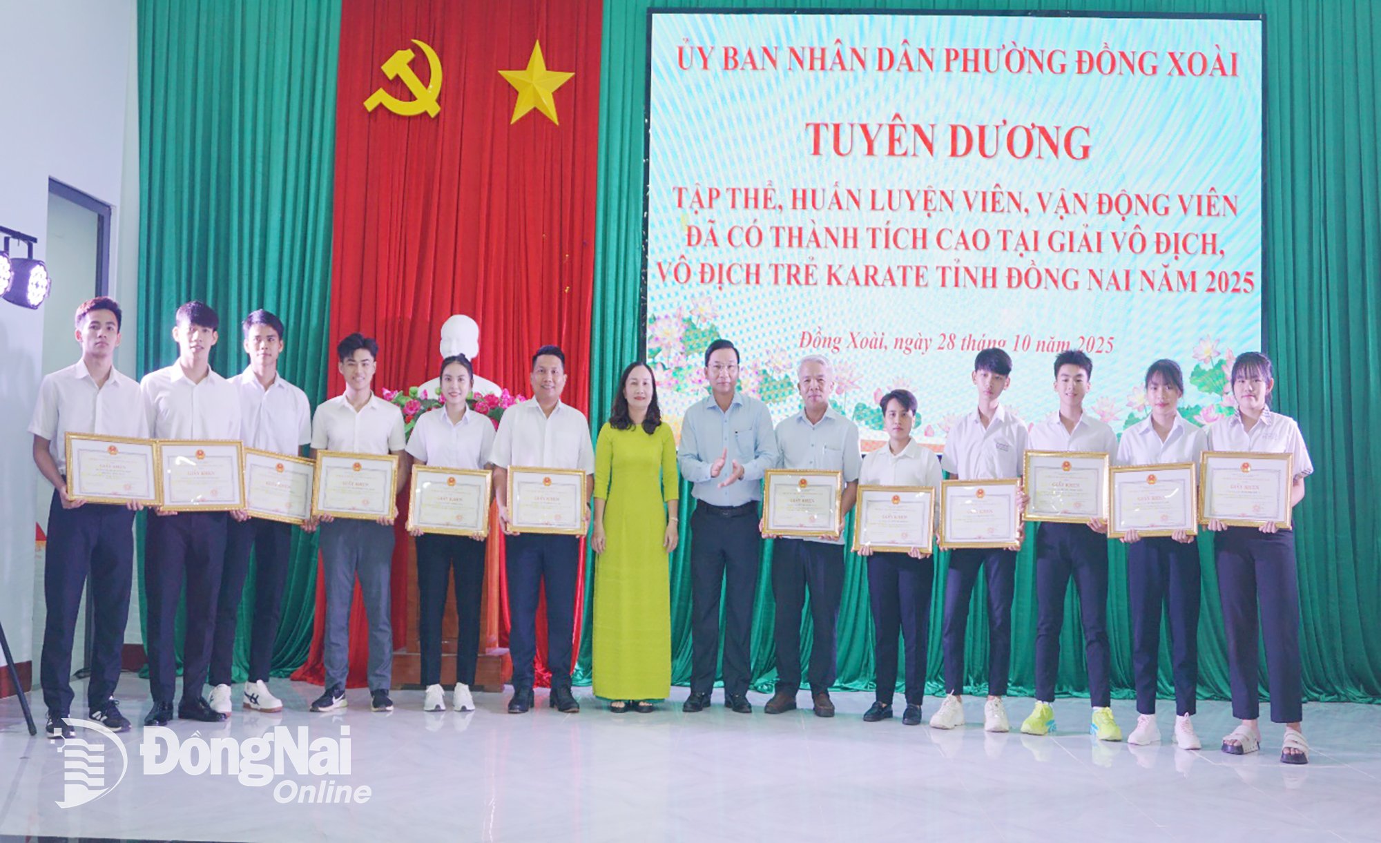 Nhằm ghi nhận những nỗ lực và thành tích đáng tự hào đó, Chủ tịch UBND phường Đồng Xoài đã tặng giấy khen cho 1 tập thể, 2 huấn luyện viên và 24 vận động viên đạt thành tích cao tại Giải vô địch và vô địch trẻ karate tỉnh Đồng Nai năm 2025.