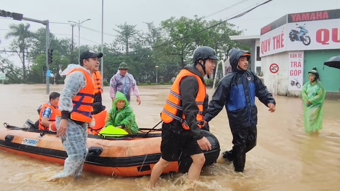 | Lực lượng chức năng phường Tuy Hòa giải cứu người dân ra khỏi vùng ngập nặng |