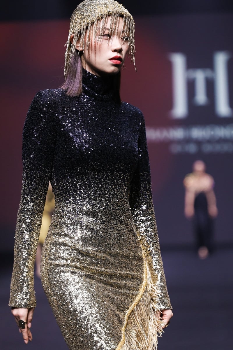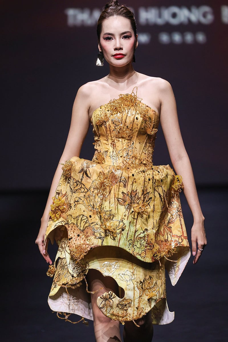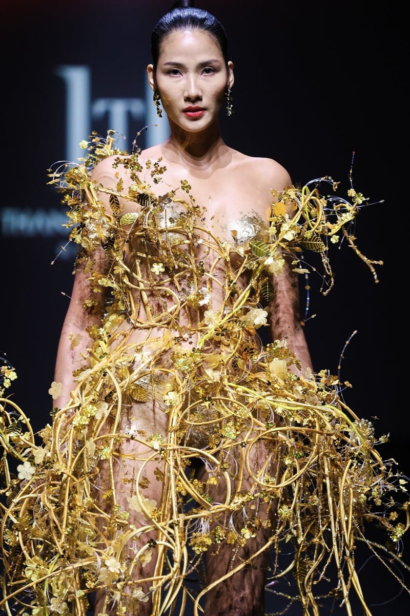 Á hậu Hoàng Thùy giữ vai trò vedette của bộ sưu tập. Siêu mẫu phải đứng 1 tiếng đồng hồ để dát hơn 100 lá vàng lên người trước khi mặc bộ trang phục lên sàn diễn. Thiết kế được thực hiện bất nguyên tắc trên phom kẽm đàn hồi với hàng trăm bông hoa được cắt 3D thủ công, tinh xảo.