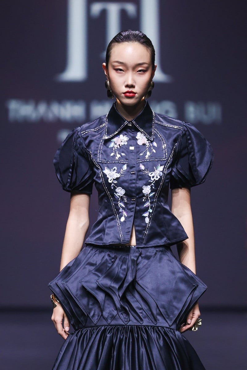 Lê Hoàng Phương mở màn bộ sưu tập với bộ trang phục lấy ý tưởng từ nghệ thuật chúc chỉ kết hợp nghệ thuật làm giấy truyền thống, cùng với cách dựng phom 3D, đính hoa nổi bằng cườm...