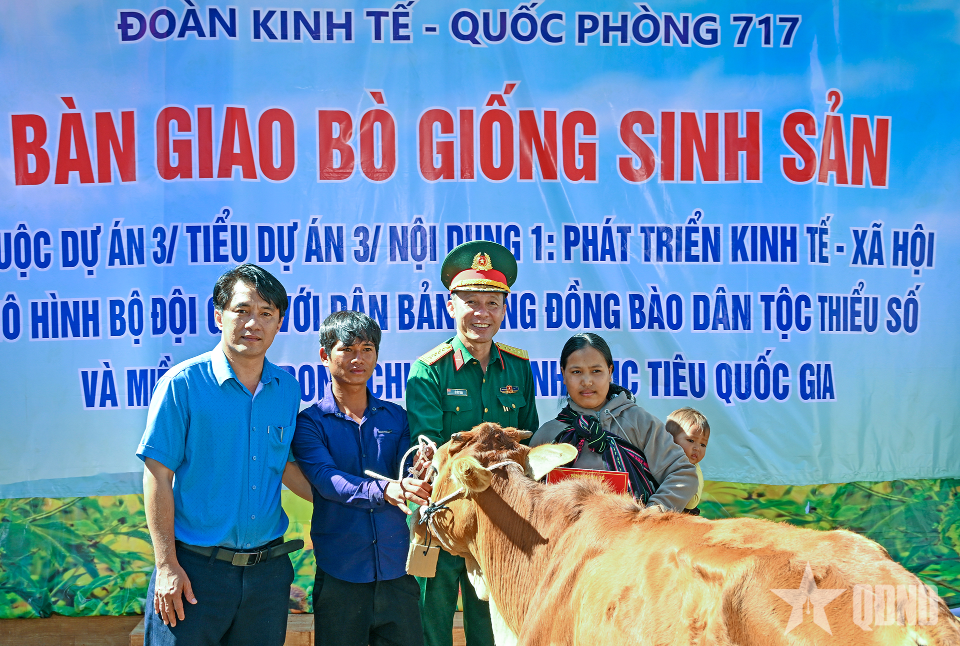 | Lãnh đạo Đoàn Kinh tế - Quốc phòng 717 và địa phương trao bò giống cho người dân. |