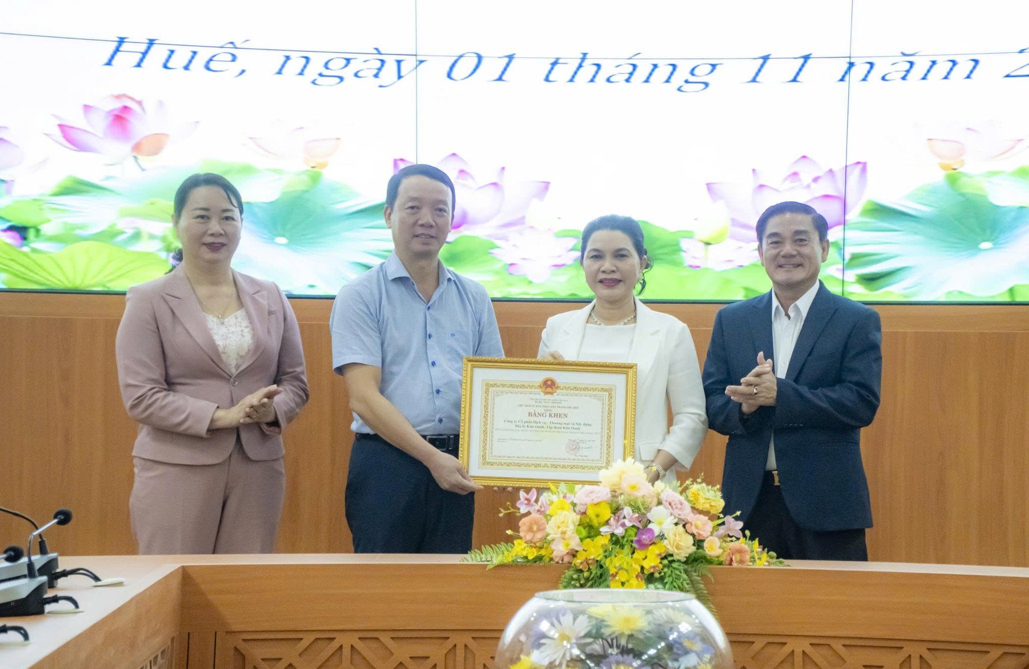 | Chủ tịch UBND thành phố Phan Thiên Định trao Bằng khen của UBND thành phố cho đại diện tập đoàn Kim Oanh vì những đóng góp to lớp trong công tác thiện nguyện |