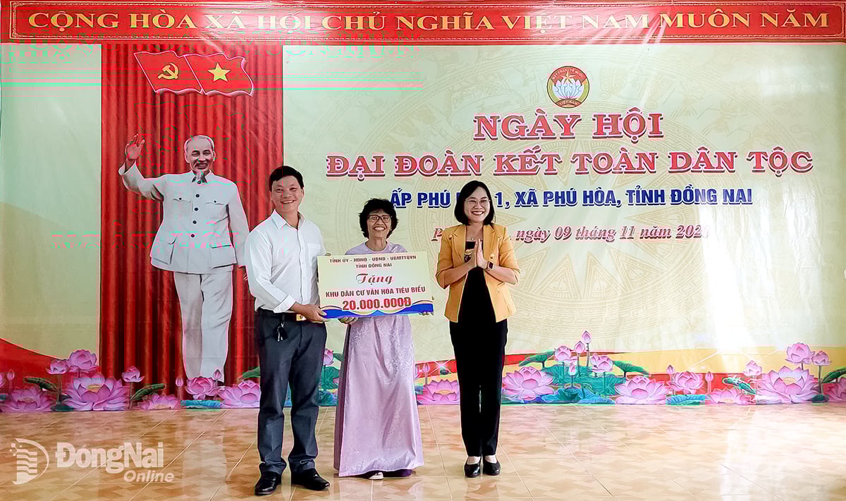 | Tỉnh ủy viên, Phó Chủ tịch UBND tỉnh Đồng Nai Nguyễn Thị Hoàng và lãnh đạo xã trao biểu trưng khen thưởng cho khu dân cư văn hóa tiêu biểu ấp Phú Hòa 1, xã Phú Hòa. Ảnh: Lê Trung |