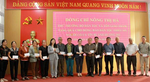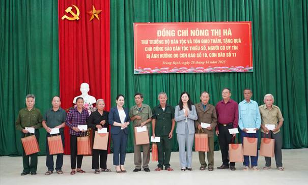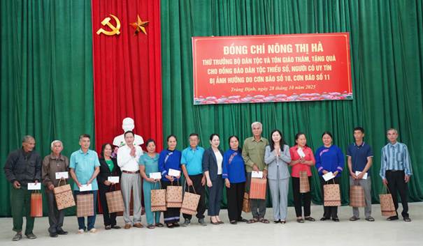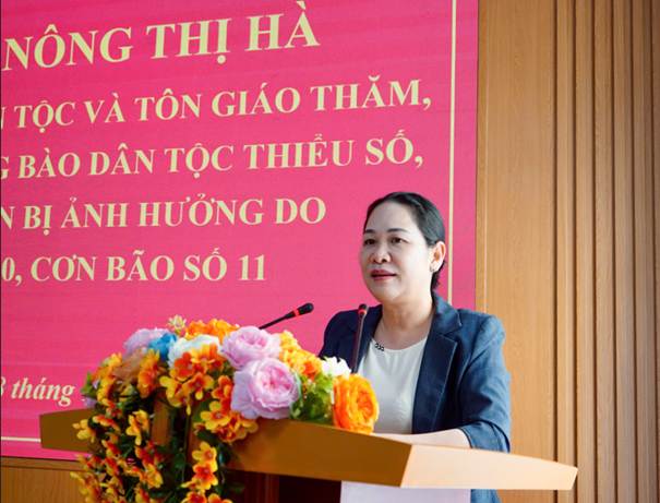Phát biểu tại buổi tặng quà, Thứ trưởng Nông Thị Hà chia sẻ: “Bộ Dân tộc và Tôn giáo luôn quan tâm, lắng nghe và đồng hành cùng đồng bào dân tộc thiểu số, đặc biệt là trong những thời điểm khó khăn do thiên tai. Mong rằng những món quà hôm nay sẽ góp phần giúp bà con ổn định cuộc sống, khôi phục sản xuất, tiếp tục vươn lên phát triển kinh tế, xây dựng quê hương ngày càng giàu đẹp.”