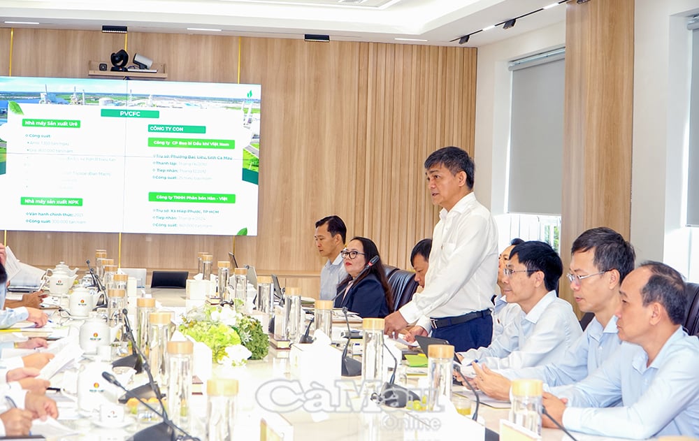 Ông Văn Tiến Thanh, Tổng Giám đốc Công ty Cổ phần - Tổng Công ty Phân bón Dầu khí Cà Mau, báo cáo với đoàn công tác về tình hình, kết quả sản xuất, kinh doanh của công ty trong năm 2025.