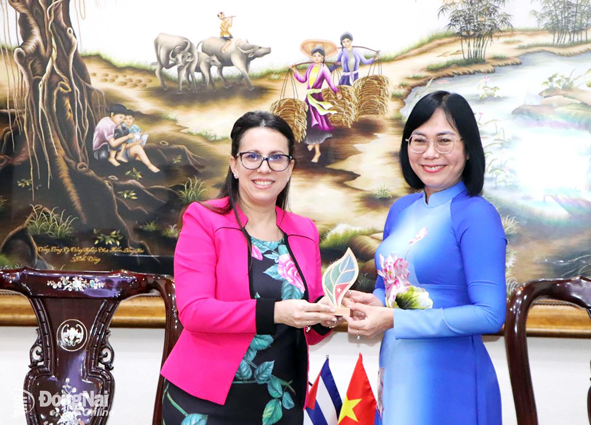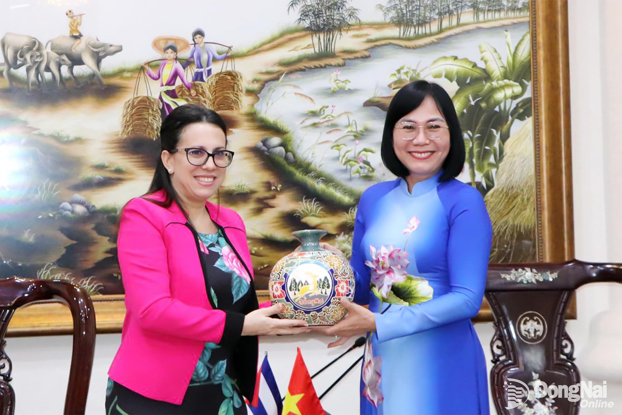 | Tỉnh ủy viên, Phó Chủ tịch UBND tỉnh Đồng Nai Nguyễn Thị Hoàng tặng quà lưu niệm trước khi chia tay bà Ariadne Feo Labrada. Ảnh: Ngọc Liên |