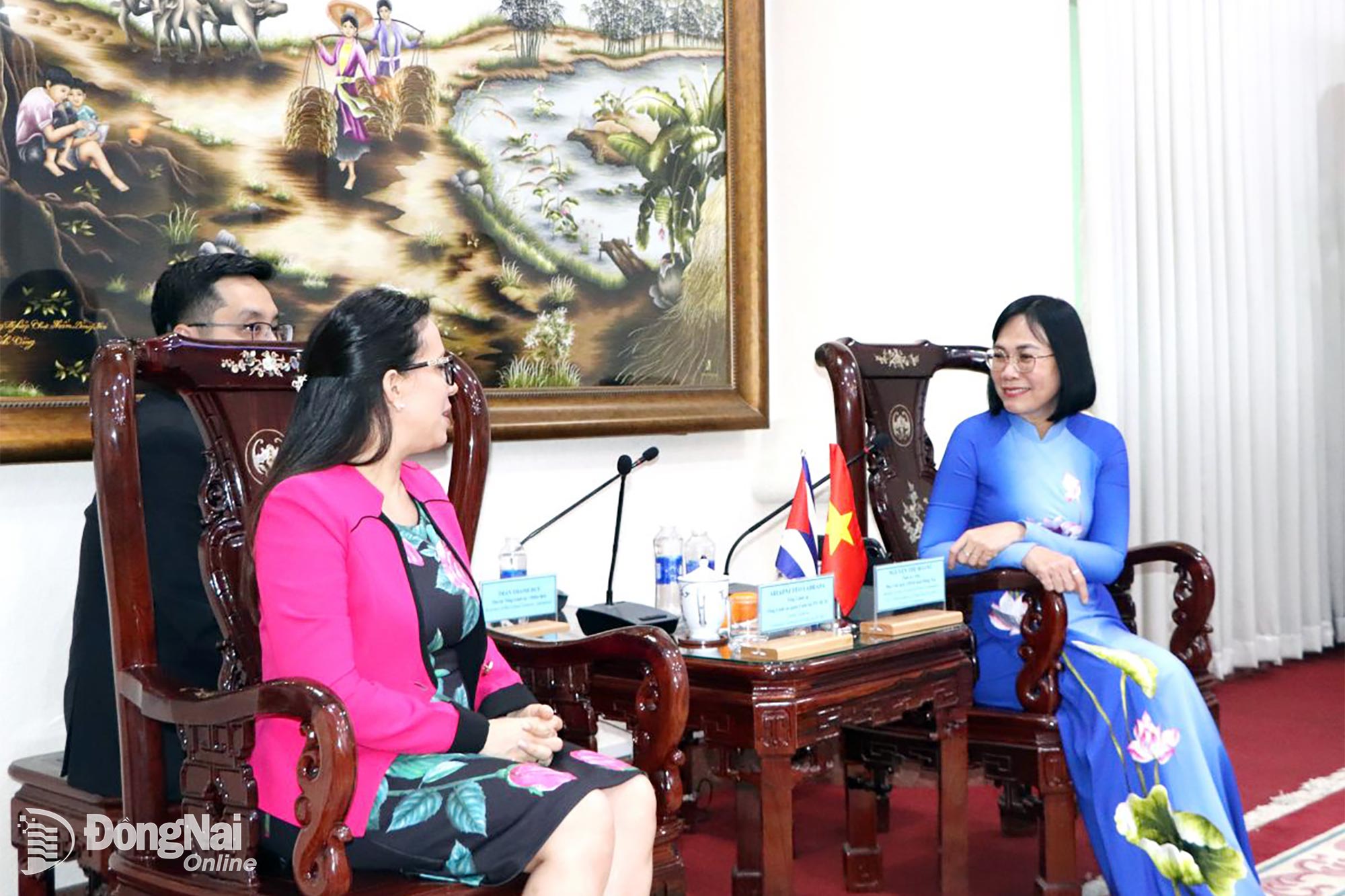 | Tỉnh ủy viên, Phó Chủ tịch UBND tỉnh Đồng Nai Nguyễn Thị Hoàng trao đổi cùng Tổng Lãnh sự Cuba tại Thành phố Hồ Chí Minh. Ảnh: Ngọc Liên |