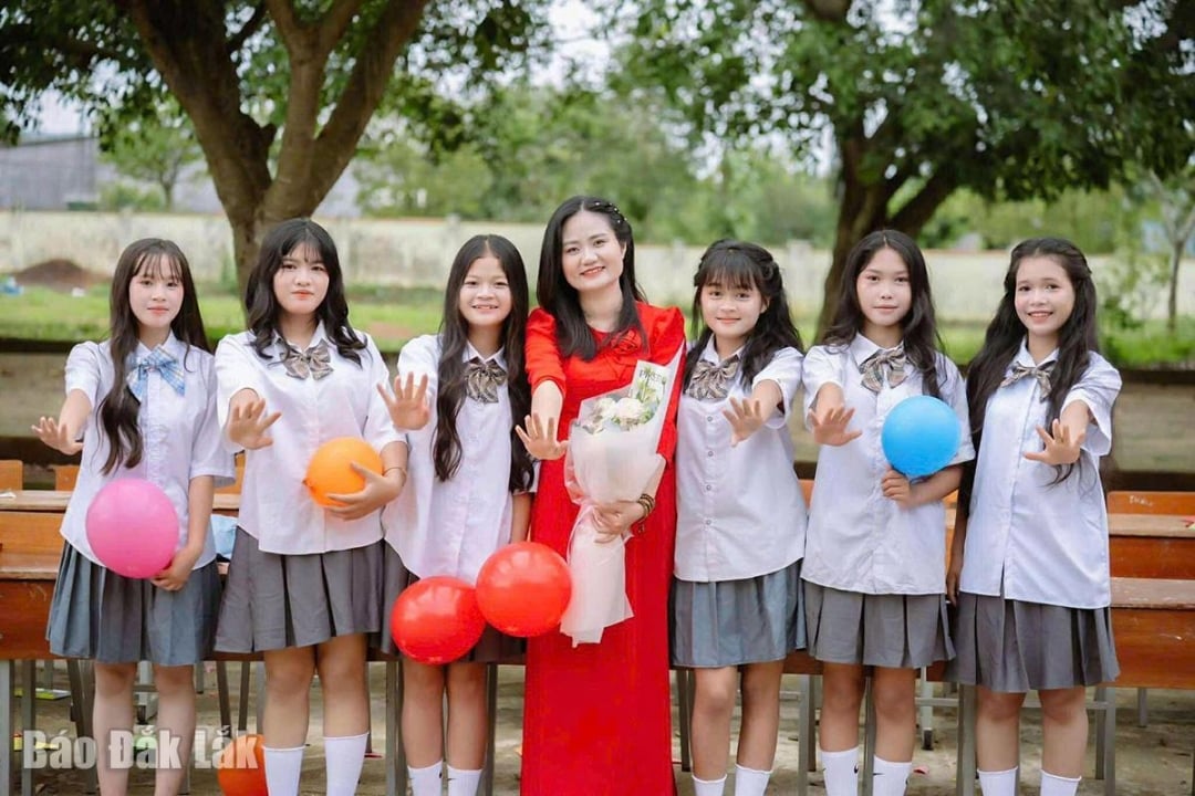 | Cô Phạm Thị Hồng, giáo viên Trường THCS Trần Quốc Toản (xã Nam Ka) và học sinh của mình. |