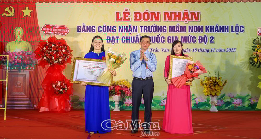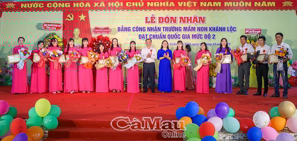 Đồng chí Nguyễn Thế Châu, Bí thư Đảng uỷ, Chủ tịch HĐND xã, và đồng chí Phan Kim Bía, Chủ tịch UBND xã Trần Văn Thời trao bằng khen cho các tập thể và cá nhân có thành tích tiêu biểu trong quá trình xây dựng Trường Mầm non Khánh Lộc đạt chuẩn Quốc gia mức độ 2.