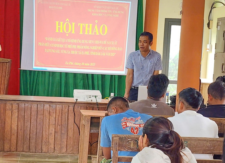 Tại Hội thảo, các kỹ sư của Trung tâm Thông tin - Ứng dụng Khoa học và công nghệ (Trung tâm) đã báo cáo kết quả xây dựng mô hình ứng dụng men ủ Bio-wa sản xuất phân hữu cơ sinh học từ phế phụ phẩm nông nghiệp đến các hộ đồng bào tại vùng sâu, vùng xa thuộc xã Ea Phê, tỉnh Đắk Lắk năm 2025. Các hộ nông dân tham gia làm mô hình báo cáo tham luận về việc trình bày lại tiến trình gia đình đã thực hiện mô hình, đánh giá những khó khăn và thuận lợi khi triển khai mô hình, trao đổi kinh nghiệm thực tế khi thực hiện mô hình, đồng thời quy trình ủ được nhắc lại các bước rõ ràng, cụ thể, dễ thực hiện để người dân có thể áp dụng và nhân rộng mô hình.