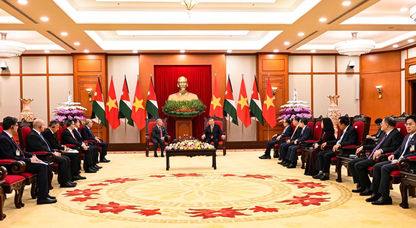 Tổng Bí thư Tô Lâm chào mừng Quốc vương Abdullah II Ibn Al-Hussein đến thăm Việt Nam, nhấn mạnh chuyến thăm cấp nguyên thủ đầu tiên giữa Việt Nam và Jordan diễn ra trong thời điểm rất quan trọng, đúng dịp hai nước kỷ niệm 45 năm thiết lập quan hệ ngoại giao (1980-2025). Tổng Bí thư Tô Lâm đánh giá năm 2026 sắp đến là một năm có nhiều ý nghĩa với hai dân tộc Việt Nam và Jordan, khi Jordan kỷ niệm 80 năm ngày Quốc khánh và Đảng Cộng sản Việt Nam tổ chức Đại hội lần thứ XIV - một Đại hội có ý nghĩa hết sức quan trọng, đề ra những định hướng đưa Việt Nam bước sang một kỷ nguyên phát triển mới.